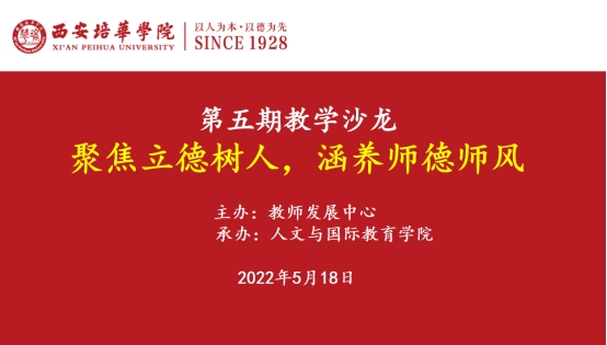 为全面贯彻落实习近平总书记关于教育的重要论述和全国教育大会精神,不断提升我校教师思想政治素质和职业道德水平,落实立德树人根本任务,2022年5月18日14点30分,由教师发展中心主办,人文与国际教育学院承办的以“聚焦立德树人,涵养师德师风”为主题的第五期教学沙龙在格物楼第四会议室如期举行。本次沙龙由人文与国际教育学院副院长赵洁副教授主持,人文与国际教育学院督导专家组组长、中文系教师赵维森教授与外语系主任、英语专业带头人胡小花副教授主讲,学前教育系薛淑静老师讲授手工制作方法,来自各学院的近30名教师参加了活动。