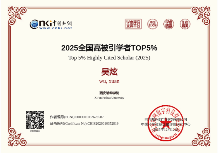 此次入选“全国高被引学者TOP5%”,不仅是对吴炫教授三十余载理论原创工作的高度认可,也彰显了西安培华学院在高层次人才引进与人文社科建设方面的显著成效。学院将以此为契机,继续支持吴炫教授开展原创性研究,进一步推动学术创新与学科发展,为构建中国自主知识体系贡献培华力量。