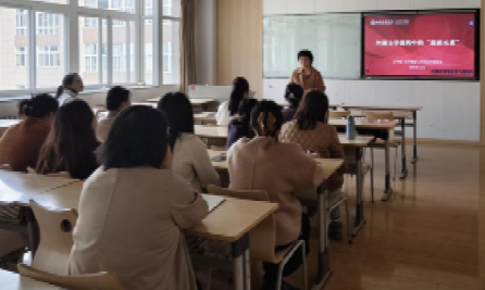 本次活动的核心报告环节由张馨月老师主讲。她结合近期教学实践与前沿教研成果,聚焦“跨学科融合”的核心诉求,从教学目标重构、内容整合、方法创新三个维度展开分享。张老师提出,外国文学教学可与历史学、艺术学、哲学等学科深度联动,通过史料佐证、影像适配、思想碰撞等具体路径,帮助学生构建多维度的文本解读框架,切实提升对文学作品的立体认知与文化思辨能力。