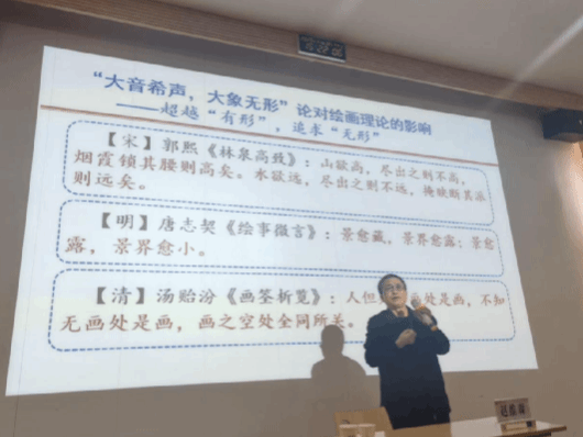 当解析“大音希声,大象无形”的哲学内涵时,赵维森教授把《道德经》第41章的文字变成了动态的思想画卷:“‘道’是一与多的交响,是有与无的辩证,是虚无与无限的统一。越是看似‘空无’,越能孕育无限可能。” 谈及对传统艺术的影响,赵维森教授的解读更是妙趣横生。他说:“‘道’的境界是艺术的‘天花板’,艺术要做的,就是在有限的形式里装下无限的意蕴。”以传统绘画为例,他信手拈来宋郭熙“山欲高,烟霞锁其腰”的留白智慧,明唐志契“景愈藏,景界愈露”的藏露之妙,清汤贻汾“无画处皆成妙境”的空处生花,再辅以宋代马麟《层叠冰绡图》的艺术实例,让听众亲眼看见“形而上旨趣”如何在笔墨间流转。