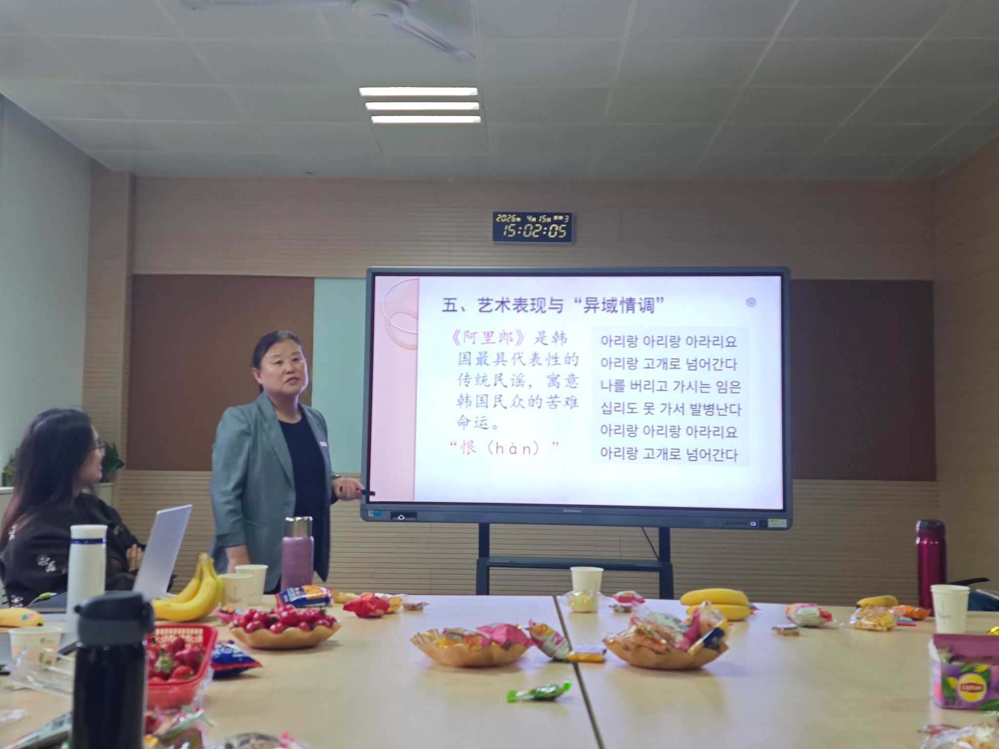 随后,刘艳萍老师围绕“中国现代戏剧中的韩国题材”这一独特视角展开系统阐述。刘老师高屋建瓴,创造性地指出剧作家选择异域题材,既源自“以韩为鉴”、借他国痛史激发民众斗争精神的创作动机,也体现了民族身份认同基础上的国际同盟意识与对世界和平的构想。刘老师重点分析了《阿里郎》等作品中的韩国乐曲、风物与人名隐喻等艺术手法,形象地诠释了抗日统一战线背景下中国现代作家的民族观、国家观与和平观。整场报告史料翔实、视角新颖,赢得了全体教师的阵阵掌声。