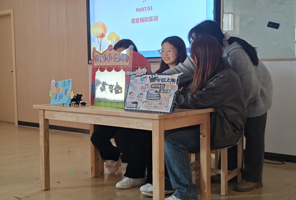 学生在《幼儿园游戏》课堂上进行实践活动