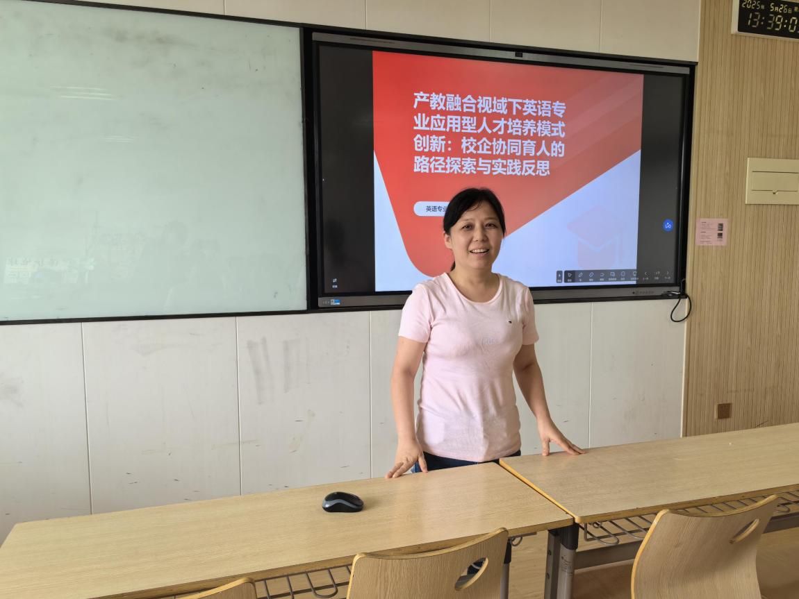 5月26日下午,英语专业教研室召开“产教融合视域下英语专业应用型人才培养模式创新”专题教研会。会议聚焦国家产教融合战略背景,以校企协同育人路径探索为核心,结合跨境电商、国际教育等行业发展需求,系统总结英语专业近年来在应用型人才培养中的实践经验与反思。本次会议由外语系副主任金培玉主持,英语专业教研室全体教师参会,刘云航副教授作主题报告。