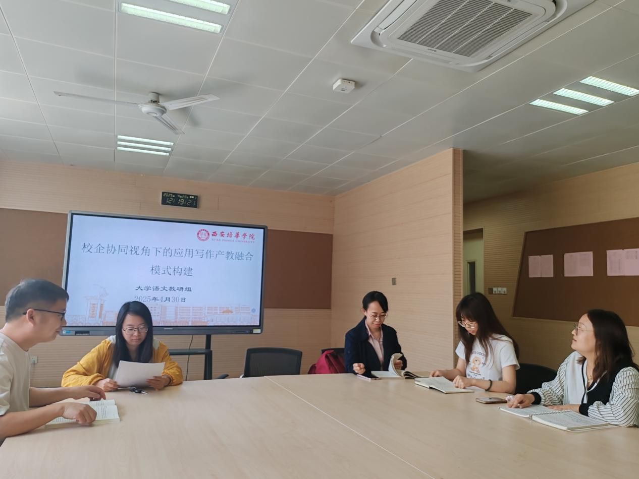 为深化大学语文与写作课程改革,探索校企协同育人的创新路径,2025年4月30日12时,中文系大学语文与写作教研室在1209教室举办专题教研活动。本次活动以“校企协同视角下的应用写作产教融合模式构建”为主题,由教研室负责人王中俊老师主持和主讲,课程组全体教师参加。