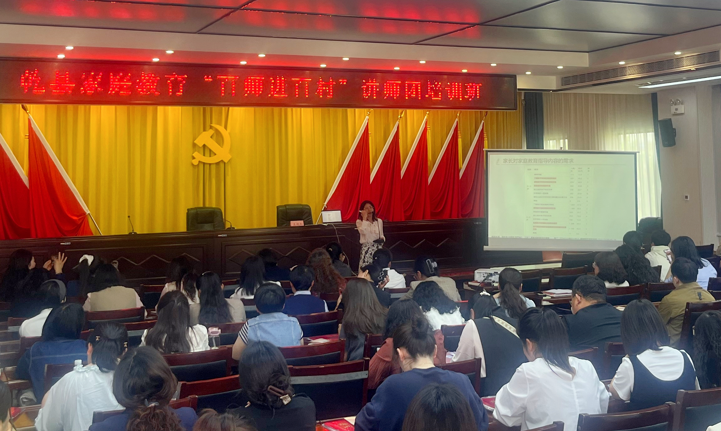 上午9时,培训活动在庄严的国歌声中拉开帷幕。乾县妇联主席刘茜在致辞中指出,家庭教育是国民教育体系的重要组成部分,乾县近年来通过“爱心妈妈”志愿服务、“点亮微心愿”关爱行动等举措,持续深化家庭文明建设。她强调,本次“百师进百村”活动旨在打造一支专业化家庭教育师资队伍,通过“送教下乡”“驻点指导”等形式,将科学教育理念送到千家万户,切实提升基层家庭教育水平。
