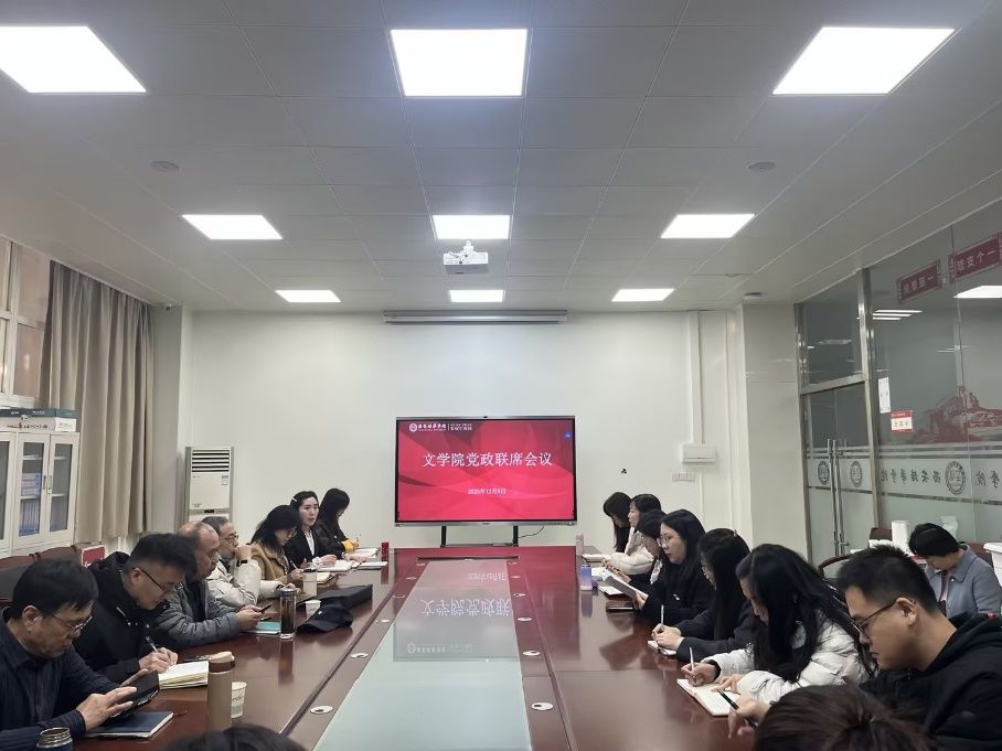 12月8日上午,文学院在格物楼1105会议室召开党政联席会议,学院党政领导班子、各教研室主任、教学督导及专业带头人、综合办公室主任、党务行政干事参加会议。会议由院长助理张萍主持。
