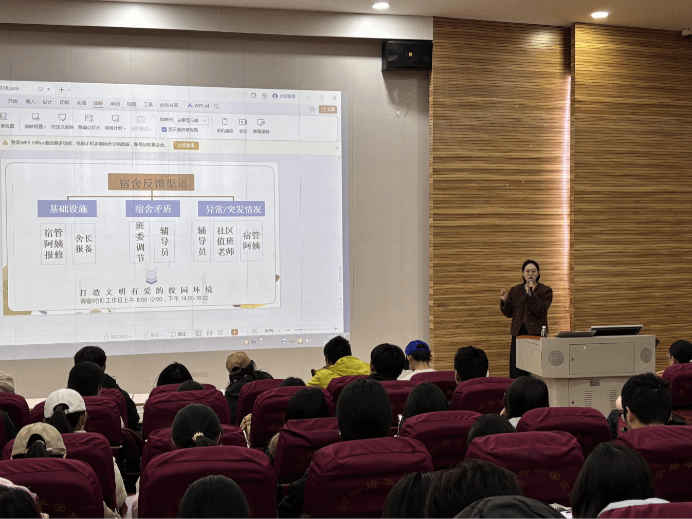 为进一步规范学生宿舍管理,强化舍长责任意识,提升宿舍治理水平,营造安全、文明、和谐的校园住宿环境,2025年11月28日中午12:30,博雅学生社区以“温馨寝室,携手共建”为主题,于格物楼J101教室组织召开。本次培训由杨苒老师主讲,2025级生活委员、舍长参会。