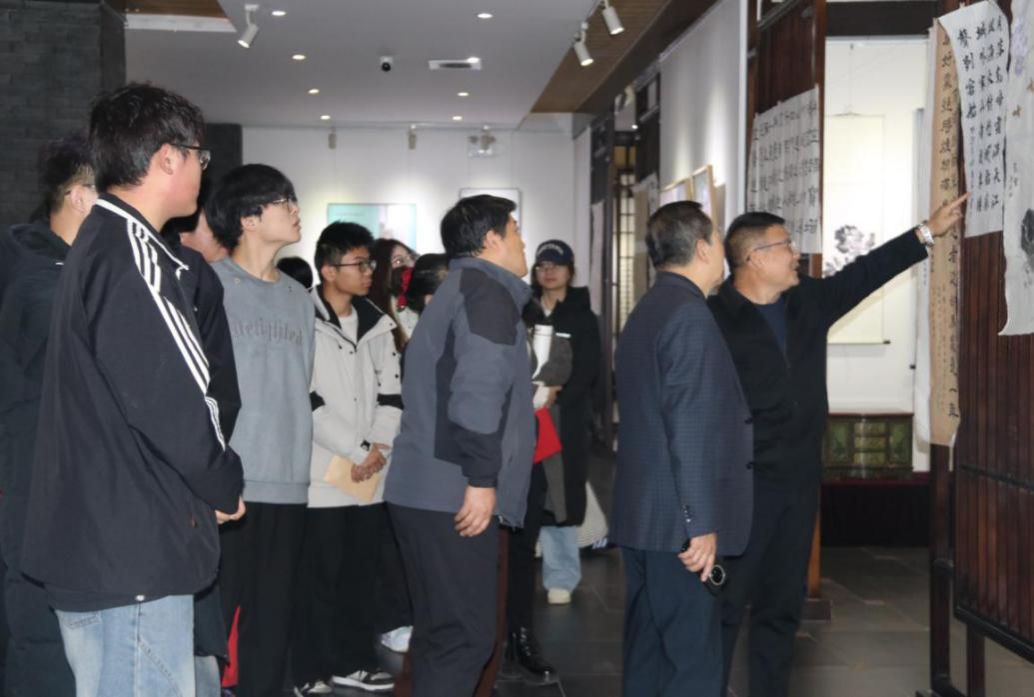 颁奖仪式落幕,嘉宾们在陈鹏涛老师的带领下移步展区,近距离感受优秀书画作品的艺术魅力。展区内,一幅幅作品各具特色:软笔书法苍劲有力、飘逸灵动,硬笔书法工整规范、清秀雅致,绘画作品意境悠远、生动传神。领导、嘉宾与同学们驻足品鉴,相互交流创作思路与心得,不时发出阵阵赞叹。