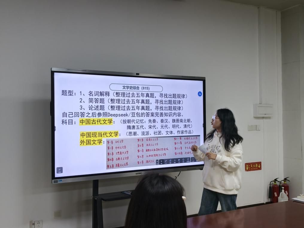 邵文波同学考取了西安工业大学中国现当代文学专业的研究生,在座谈会中,她以“框架梳理+真题溯源”为核心,系统拆解了专业课复习策略。她强调:“现当代文学的复习需以时间轴为脉络,按文体纵向梳理作家作品,再结合真题反向定位知识点。”此外,她特别提醒学弟学妹重视教材注释与研修书目。针对文学评论写作,邵文波同学也分享了自己的经验心得以及参考的课程和资料。