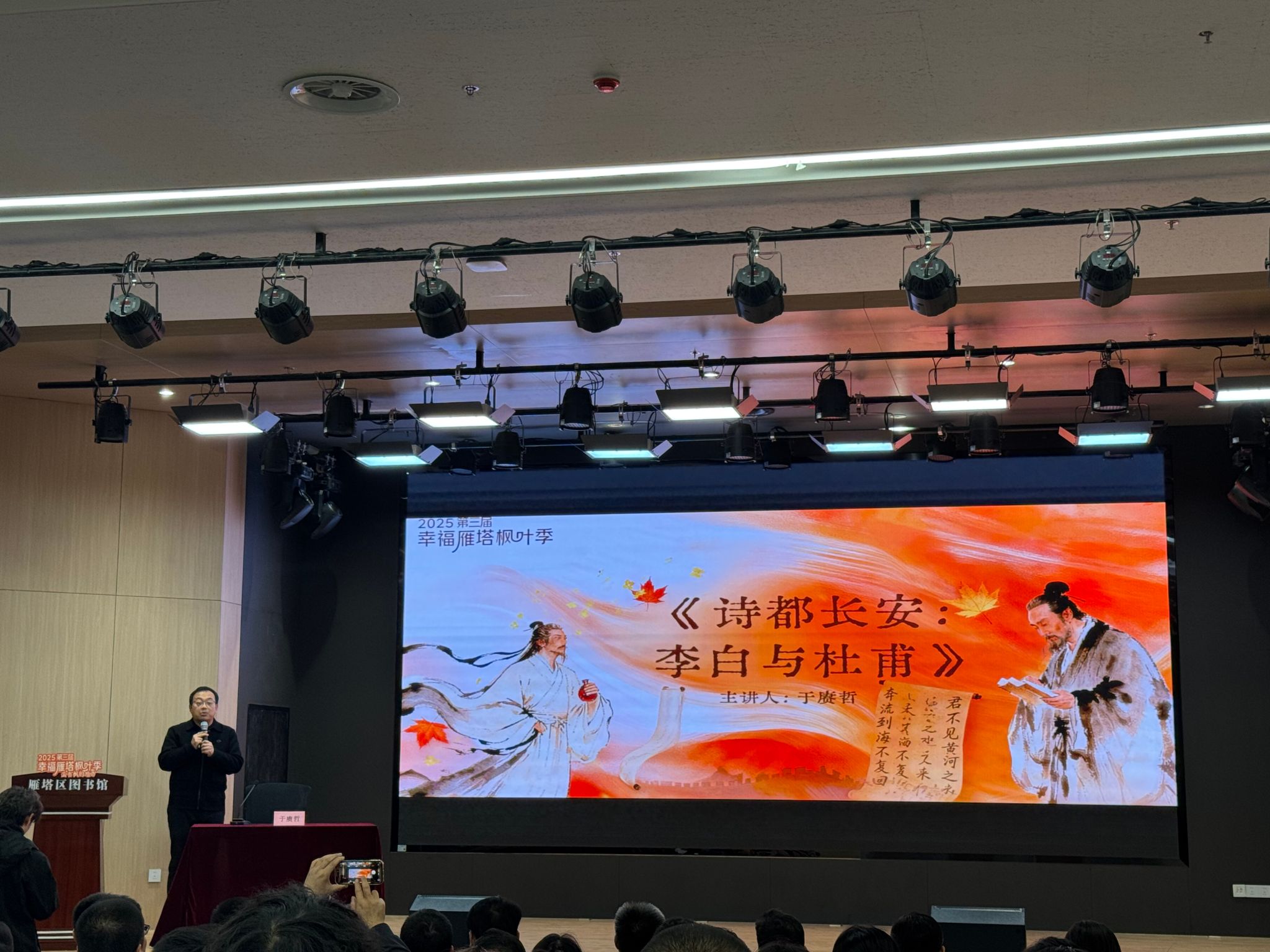 2025年11月7日下午,文学院师生受邀参加了第三届幸福雁塔枫叶季 “诗都长安:李白与杜甫” 秋日读书会。读书会在雁塔区图书馆新馆温情启幕。西安培华学院文学院作为深耕长安文化研究与传承的重要力量,全程参与活动,沉浸式体验了此次文化盛宴。