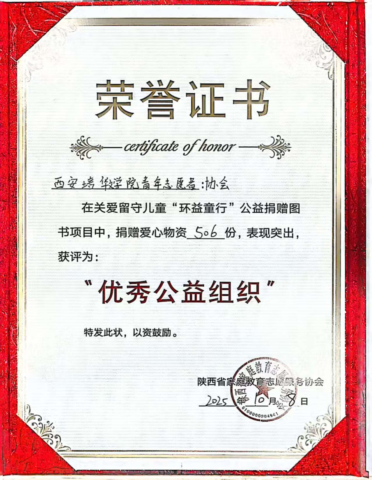 近日,陕西省家庭教育志愿服务协会为西安培华学院文学院青年志愿者协会颁发荣誉证书,表彰其在关爱留守儿童“环益童行”公益捐赠图书项目中捐赠爱心物资506份的突出表现,授予该协会“优秀公益组织”称号。
