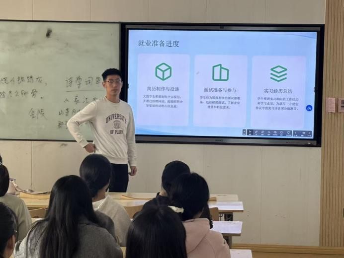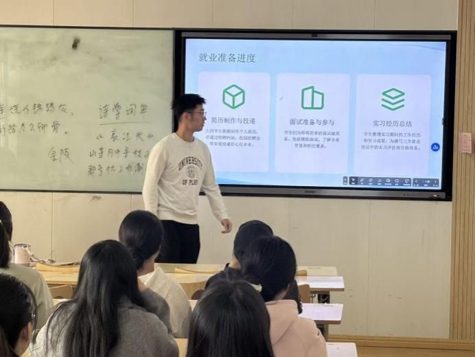 宣讲伊始,吴老师围绕“就业准备进度”展开细致分享,从简历制作与投递大学生积极制作个人简历,通过招聘网站、校园招聘会等渠道投递心仪企业,到面试准备与参与为面试做模拟演练、了解企业背景与岗位要求,再到实习经历总结梳理实习工作经历与学习成果,为就业协议实习评价做准备,分维度讲解就业前期准备的关键要点,让同学们对求职前序步骤有了清晰且直观的认识。