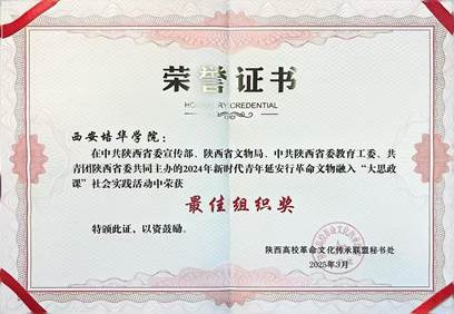 4月24日,在陕西革命文化融入“大思政课”建设推进会上,我校荣获“新时代青年延安行”革命文物融入“大思政课”社会实践活动最佳组织奖。该活动由陕西省文物局、中共陕西省委宣传部、中共陕西省委教育工委、共青团陕西省委联合主办。