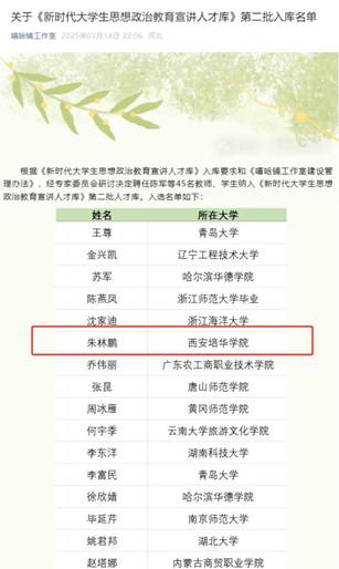 根据《新时代大学生思想政治教育宣讲人才库》和《嘻哈铺工作室建设管理办法》要求,经专家委员会研讨,人文与国际教育学院辅导员朱林鹏入选新时代大学生思想政治教育宣讲人才库。