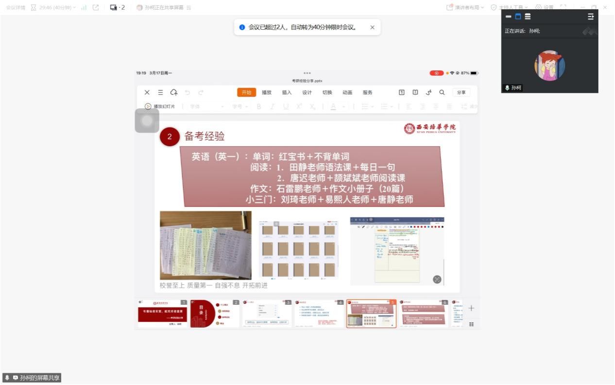 贾尚涵学姐首先分享了她的考研经历。她从备考规划、时间管理、复习方法等多个角度,详细讲述了自己在考研过程中的心得体会。她特别强调,考研是一场持久战,既需要坚定的信念,也需要科学的方法。她建议同学们在备考过程中要制定详细的计划,合理分配时间,注重基础知识的积累,同时保持良好的心态,积极应对备考中的各种挑战。