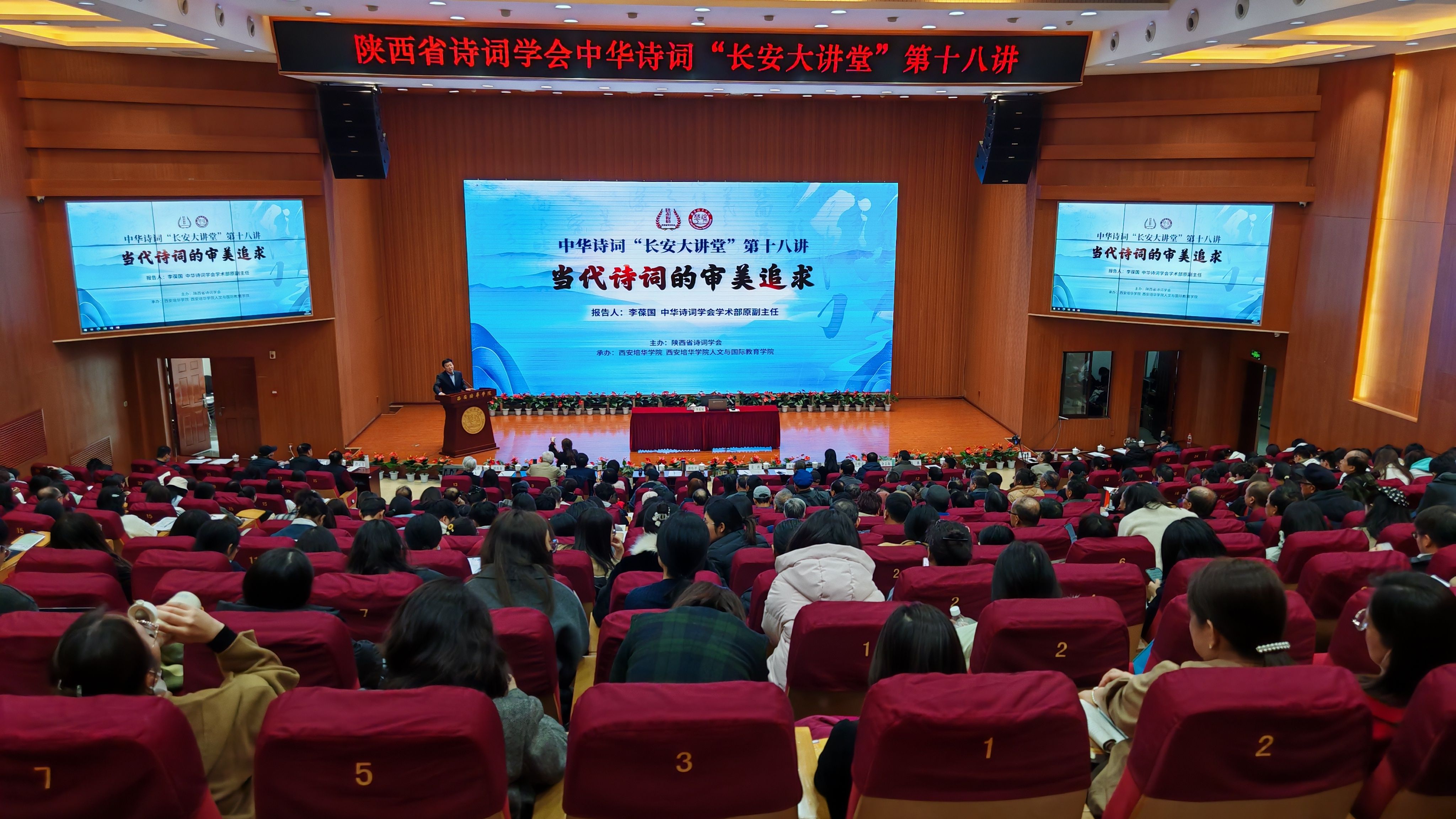 2025年3月15日,由陕西省诗词学会主办,西安培华学院、西安培华学院人文与国际教育学院承办的中华诗词“长安大讲堂”第十八讲,在我校维之图书馆报告厅成功举办。本次讲座的主题为“当代诗词的审美追求”,由中华诗词学会学术部原副主任李葆国先生担任主讲嘉宾。来自全国各界的诗词爱好者、西安培华学院人文与国际教育学院中文系全体教师以及人文与国际教育学院部分学生,共计400余人参加了此次讲座。