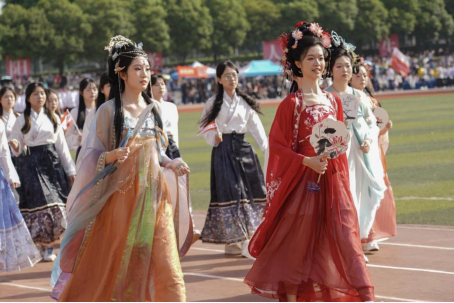 风传花信,雨濯春尘。这是一支特别的队伍,是由88位国家奖学金与国家励志奖学金获得者组成的方阵。火红的校旗随风扬起,迈着矫健的步伐走向主席台。他们身着马面裙,踌躇满志、意气风发,他们遨游学海、能文能武,尽显“书生意气,挥斥方遒”的青年风采,着一袭古衣,承千载风华,观乎于人文,以化成天下。