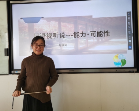 此次说课大赛共有三位青年教师参加。担任《日语视听说》课程的赵楠婷老师首先进行了说课演示。赵老师根据教学目标,合理运用教材,设计课堂教学。重点介绍了有针对性的课程设计、形式多样的课堂互动和富于启发性的课外作业四个方面。