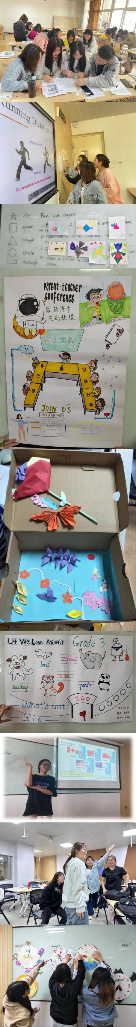 组织“My school day”的板书设计大比拼活动,有的同学以“学校的一天”为主题制作钟表、有的同学观察学校的动植物利用折纸制作板书素材,探索花朵、蝴蝶、树叶、等动植物的特点,有的同学以学习学习为主题,利用不同文具的简笔画完成英语词汇课程板书设计。同学们积极探讨不同年级学生的心理认知特点,思考如何利用板书吸引学生课堂注意力。学生们在图文并茂的板书绘画过程中,探索板书设计的特有魅力。