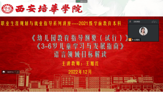 人文与国际教育学院学前教育专业王旭红老师,针对2021级学前教育本科学生,开展了题为“《幼儿园教育指导纲要(试行)》《3-6岁儿童学习与发展指南》语言领域目标解读”职业生涯规划和就业指导系列讲座。讲座中,王老师强调了《指南》《纲要》两个文件在学前教育专业学生学习及未来工作中的重要性,并对两个文件中“语言领域“目标做了详细解读。通过此次讲座,学生提升了对《指南》、《纲要》两个文件重要性的认识。