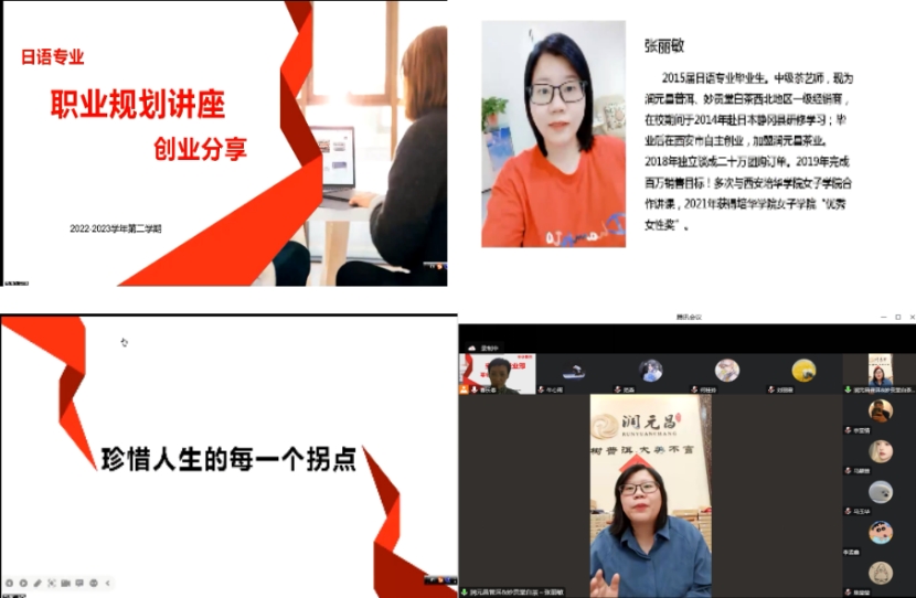 12日的晚19点开始,张丽敏经理围绕“珍惜人生的每一个拐点”的主题分享了她的创业经历。从一位日语专业的毕业生到培训机构的教师,再到专业的茶叶经销商,张经理的成长精彩又富有挑战。分享完她的职业成长经历后,张经理也分享了成功的精髓:不要放弃学习的能力、有个进阶式的学习、提升自己的思维、有深耕的勇气。最后,针对我专业学生的疑问,张经理给予了亲切又真诚的解答。