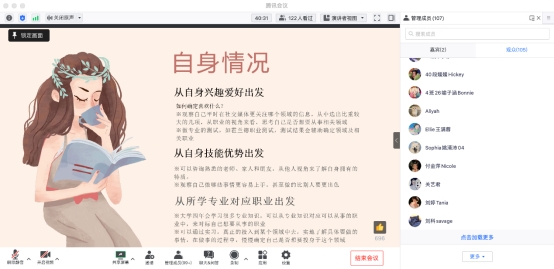 随后,在职业定位这一环节中,毕经理主要向同学们介绍了如何结合自身情况及大环境进行职业选择。首先要从自身的兴趣爱好出发,确定什么职业是可以让自己一直保有热情的;其次,要从自身的技能优势出发,判断自己在做哪些事情时更容易上手,可以比别人做的更出色;最重要的是,要结合所学专业进行选择。在职业选择上,她强调了自己充分利用了在商务英语方面的优势,进入了阿里巴巴总部从事电子商务方面的工作。同时,她也给同学们提供了许多最新的专业求职信息。