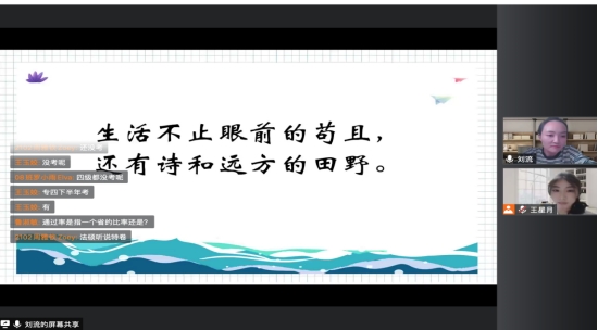最后,刘流博士寄语同学们:生活不止眼前的苟且,还有诗和远方的田野。本次讲座虽然是线上研讨,但同学们反响热烈,热情互动,同学们纷纷表示获益匪浅。刘流博士的精彩分享帮助同学们更加明确了如何进行更清晰的职业规划。愿同学们都能在未来开创出自己的一片天地!