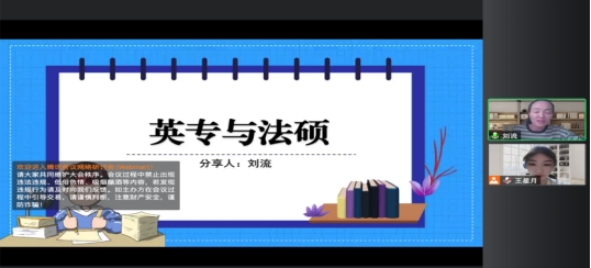 随后,刘流博士向同学们介绍了法律硕士的相关内容。法律硕士指本科为非法学但是硕士为法学,对于英专生来说就是“英语+法律=涉外法律人才”的强强联合。刘流博士也向同学们罗列了考法律硕士(非法学)的优点,最大最吸引人的莫过于不用考数学;其次,法硕的就业范围较广,无论是考公、事业单位、国企还是外企都需要法律人才。