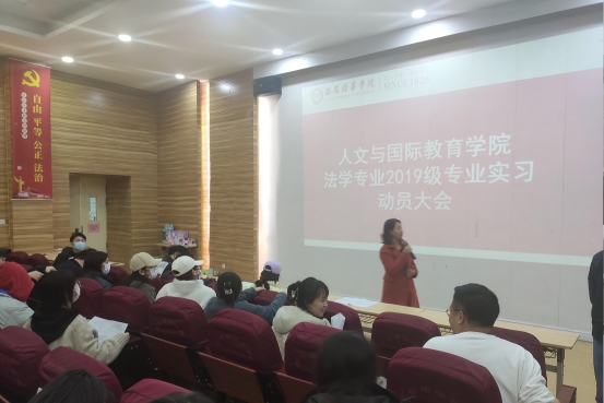 西安培华学院人文与国际教育学院法学专业2019级专业实习动员大会于2022年11月16日下午在格物楼J101举行。由人文与国际教育学院法学系马亚乐主任、张丽莎老师主持,法学系2019级学生参加。
