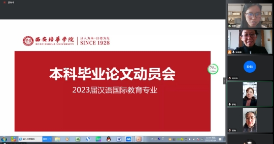 2022年10月14日中午12:15分,中文系汉语国际教育专业召开了2023届毕业论文动员大会。根据疫情防控要求,本次动员大会在线上通过腾讯会议召开。汉国教专业6位指导老师和46位应届毕业生参加了本次会议。会议由张莉霞老师主持。