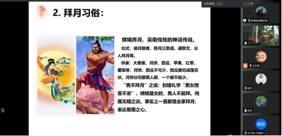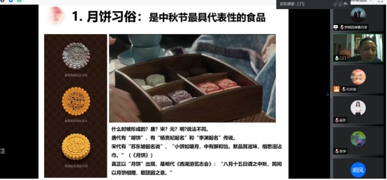 最后,闫建滨教授对中秋节习俗的形成及其文化内涵进行讲解,如月饼习俗的形成有唐、宋、元、明等不同说法。自唐宋以来,八月十五是一年中的最佳赏月时成为传统,并与大家分享了各地不同的特色习俗。
