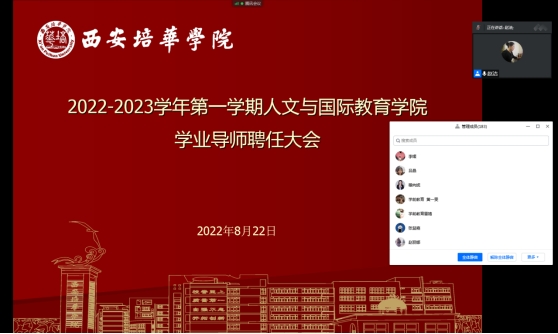 为进一步落实《西安培华学院学业导师管理办法(试行)》(培华院教发〔2022〕47号),全面推动学业导师的队伍建设,2022年8月22日15点,人文与国际教育学院在线上召开2022-2023学年第一学期学业导师聘任大会。参加本次会议的有人文与国际教育学院常务副院长、学业导师工作领导小组组长梁蕊,党委书记兼行政副院长、学业导师工作领导小组副组长南兵,教学副院长、学业导师工作领导小组副组长赵洁,人文与国际教育学院学业导师工作领导小组全体成员,人文与国际教育学院全体学业导师。会议由人文与国际教育学院教学副院长、学业导师工作领导小组副组长赵洁主持召开。