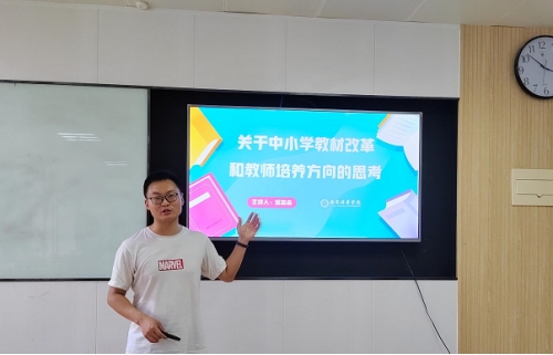 天朗气清,惠风和畅,沐浴着午后的暖阳,人文与国际教育学院中文系于4月27日14点至16点在1402教室举行了主题为“关于中小学教材改革和教师培养方向的思考”的教学法研讨活动,主讲教师为姬志垒老师,中文系主任付丽伟副教授主持,中文系全体教师参加了此次研讨。姬志垒老师从自身多年中小学教学经验出发,围绕四个方面分析了近日教育部中小学教材教学改革的新动向、新变化,为大家进行了一次精彩的分享,明确了未来语文老师职业发展的方向,为中文系教师方向的学生培养提供了极具价值的现实参考,活动现场气氛热烈,掌声阵阵。