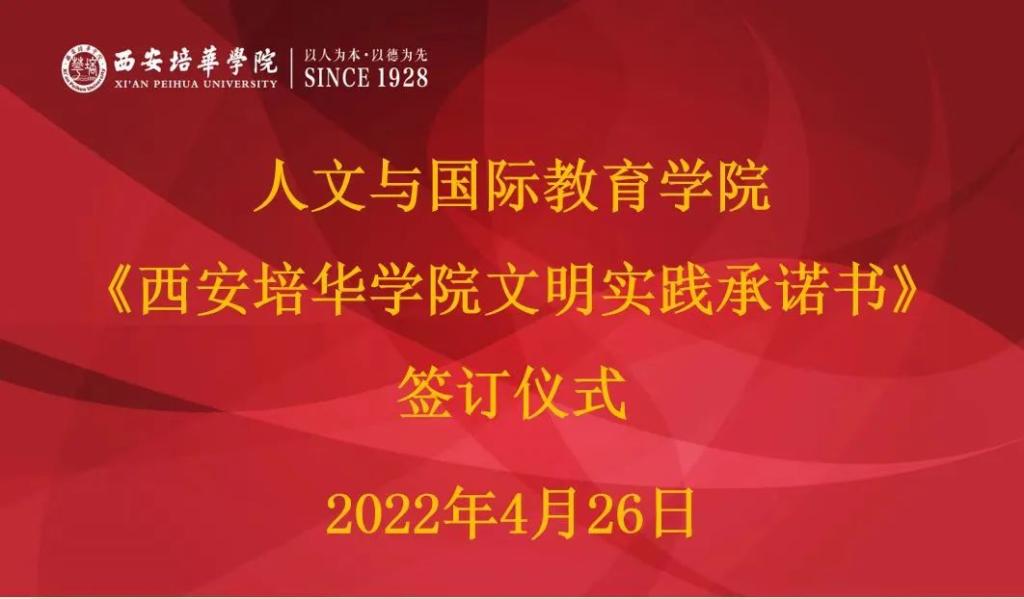 为培育和践行社会主义核心价值观,将习近平总书记关于精神文明建设的重要论述贯穿于校园文明实践的全过程,不断提高全体师生的道德素质和文明素养,争做文明实践行动的倡导者、践行者、引领者。我院于4月26日在第四会议室开展了《西安培华学院文明实践承诺书》签约仪式,参会人员有教师代表和学生代表,本次签约仪式号召全体师生做到以下几点: