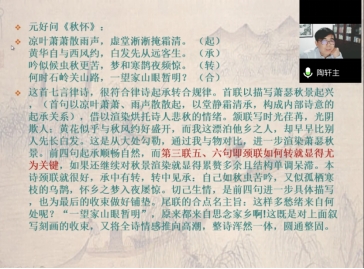 李教授还在研讨中分享了很多自己在日常生活中创作的优秀诗歌作品,进一步解释他是如何运用“起-承-转-合”来创作诗歌作品的。在分享中,他还提出了自己在诗歌研究和创作中的主张——“带着原创进课堂”,李教授希望通过教师的自主创作,来激发学生对诗词学习的兴趣,并提高教师的教学研究能力。