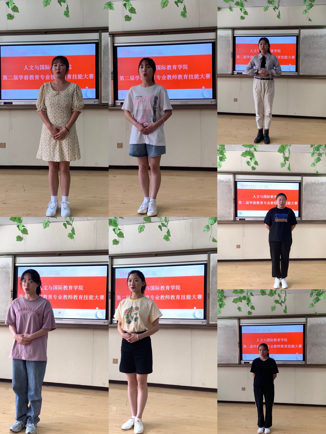 本次学前教育专业教师教育技能大赛赛项共有四项,分别是片段教学、幼儿园教育活动设计与说课、命题画以及保教活动分析。其中后两个赛项于5月26日举行并已统计得分,前两项于今日开展,选手们根据抽签顺序上台展示,评委们根据评分点严格打分,最终由计分员结合所有赛项得分进行排名。本次比赛的评委由刘迎接、申涵子、王旭红、刘思雨、张雅雯、董雪菲、王怡雪担任。