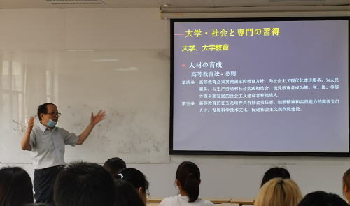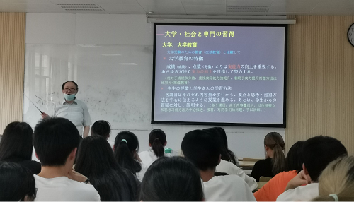 刘建强教授从高等教育及日语专业的人才培养观念目标开讲,系统地介绍和讲述了当前社会对于外语人才需求的特点和我国外语教育特别是日语专业教育应对新需求而推进的教学改革和课程调整。同时结合本专业近年来在教育教学上变革发展的实际,从理论到实际,从宏观层面到课堂具体事例,用中日双语深入浅出而又清晰地讲述了大学教育及人才培养目标理念、社会发展趋势和人才需求、专业的教授与学习、与应试教育的不同点和正确方法途径等问题。随后就问卷调查中的若干问题进行了解答回复,在最后的提问阶段,回答了几位同学的问题。