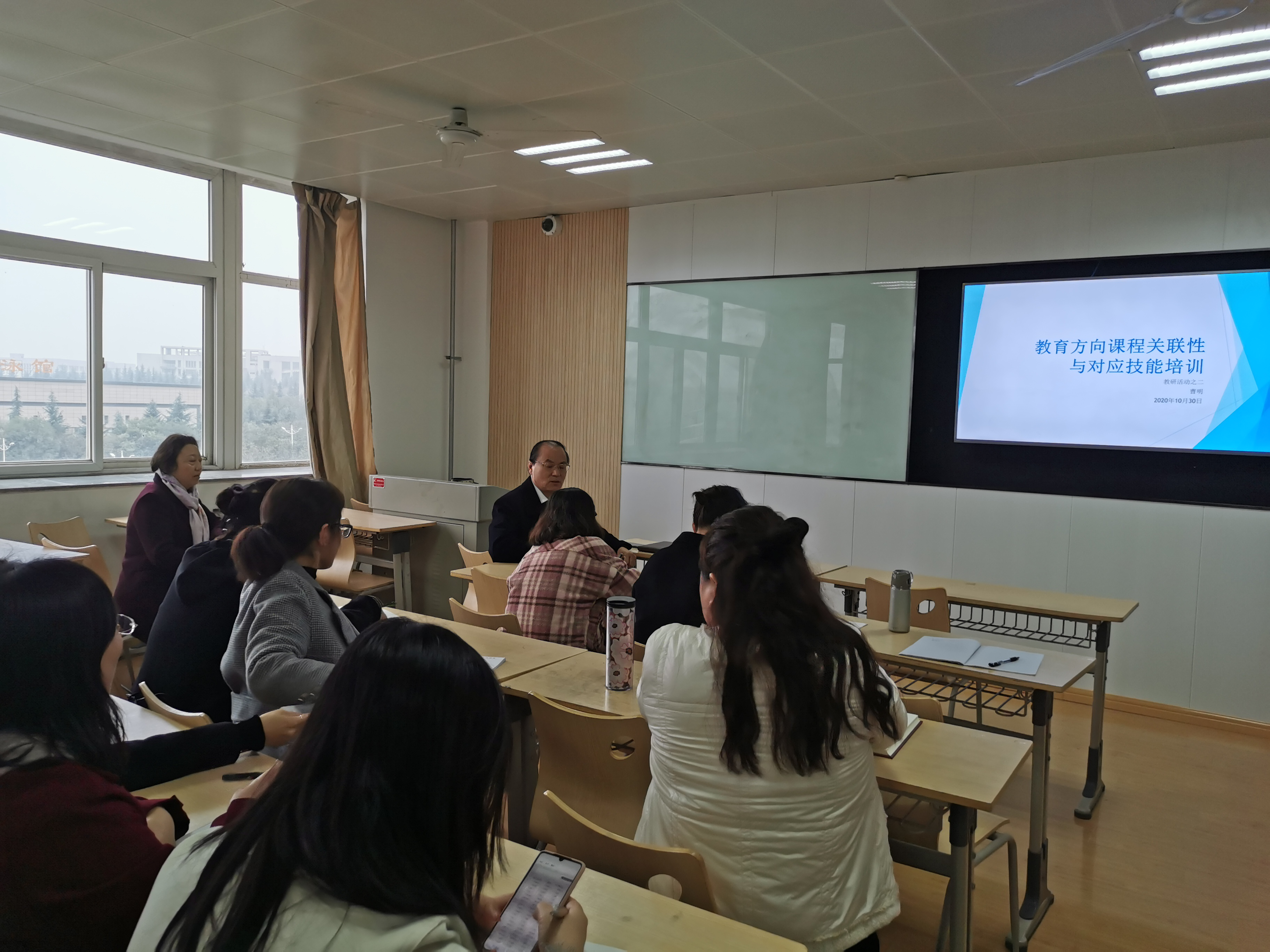 我院英语专业教研室全员18人在甘世安主任的主持下,于2020年10月30日下午14:00-16:00在1501教室由曹明老师发起了英语专业关于教育方向课程关联性与对应技能培训的教研会议。教研过程如下: