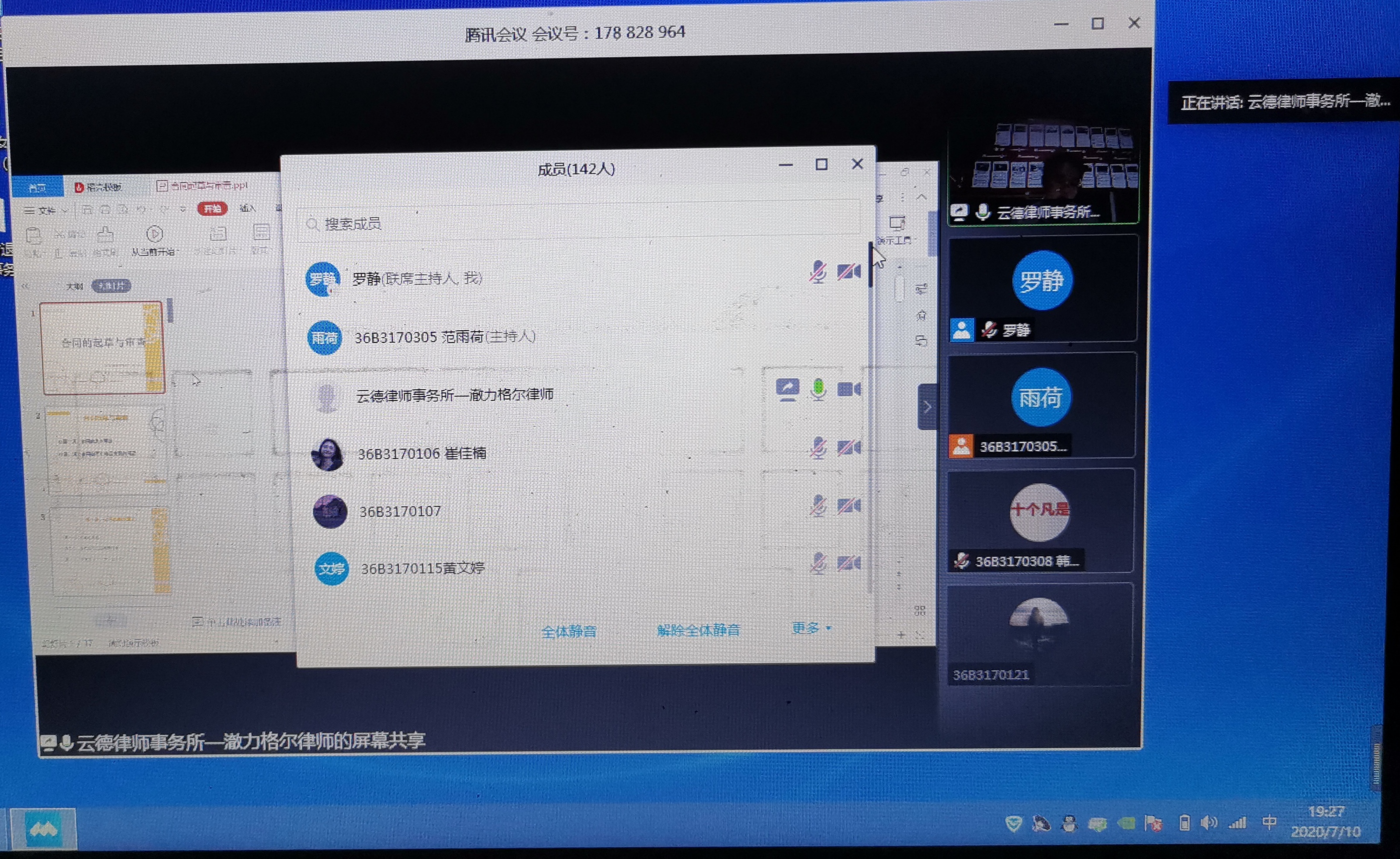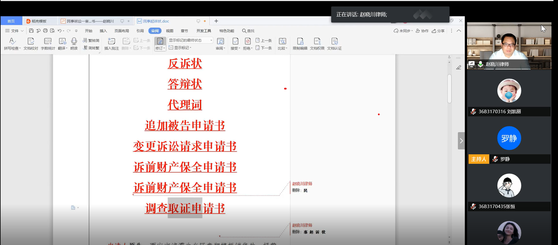 此次系列讲座采取线上讲授的方式,通过腾讯会议平台,由法学系副教授罗静老师主持,诚邀陕西云徳律师事务所的三位律师就各类法律实务工作中常用的法律文书写作方法与学生进行分享交流。