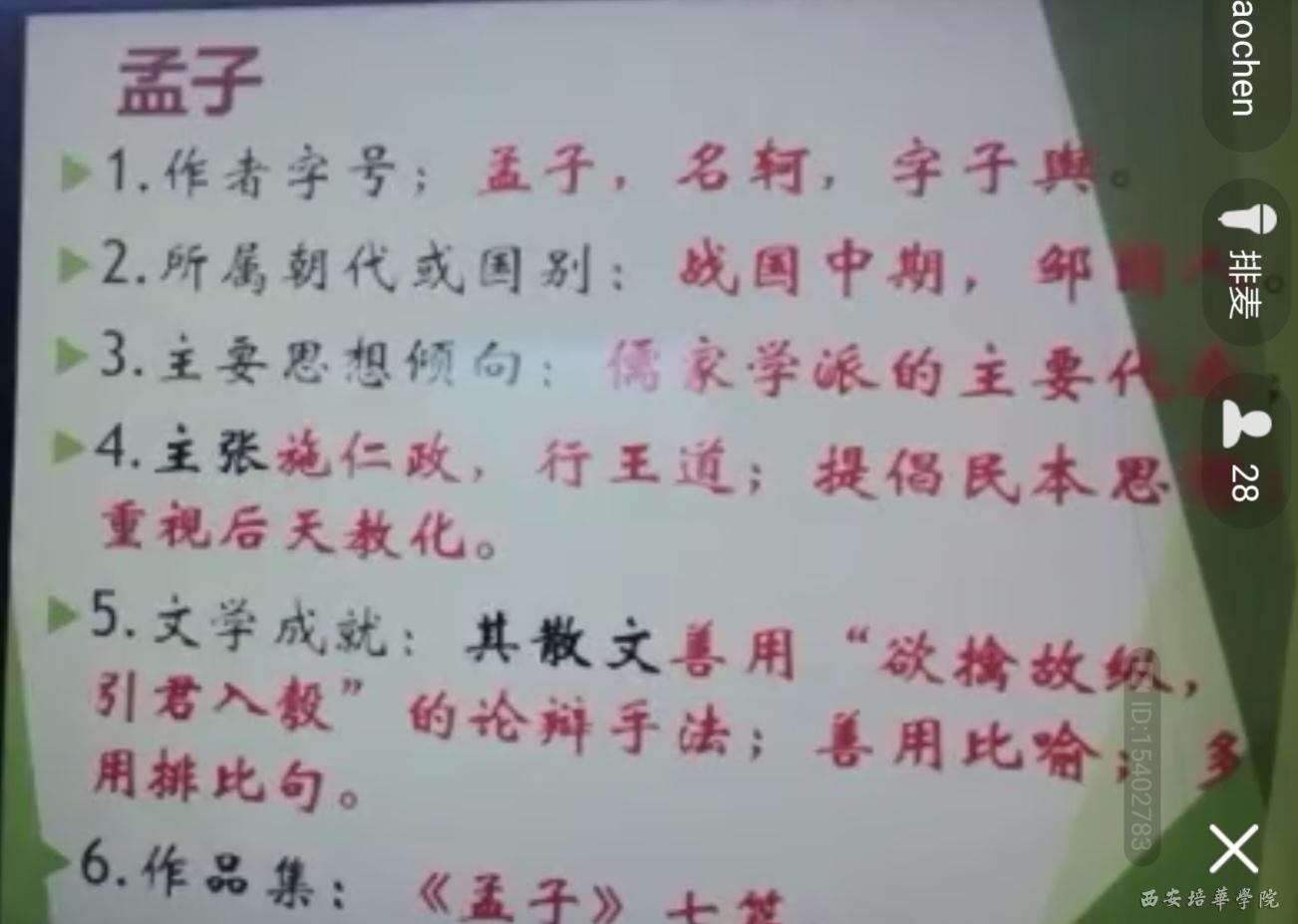 陈老师在讲座中不仅为学生标识出了重点复习篇目,还出示了相关知识点的具体复习方法。比如以《左转》的学习归纳为例,引导学生进行散文的复习总结;以孟子为例,示范重点作家基本知识的梳理回顾。