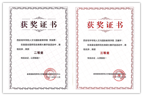 2019年12月,为进一步推进新媒体、新技术深入应用,促进数字教育资源共享,提高师范生信息化教学能力,加快信息技术与教育教学深度融合,教育部陕西师范大学基础教育课程研究中心联合西北教师教育联盟共同组织了“全国首届师范生微课大赛”,大赛由陕西师范大学协办。本此大赛包含校级初赛、全国决赛,决赛通过网络上传参赛作品,采取专家评审和网络评审相结合的方式进行,共有28个省市及自治区、共计93所学校参加了本次比赛,参赛作品达1452份。经过半年的网络与评审专家的严格评审,我校2017级学前教育专业学生李辰茜荣获了全国“二等奖”、王巍华荣获了全国“三等奖”的荣誉。