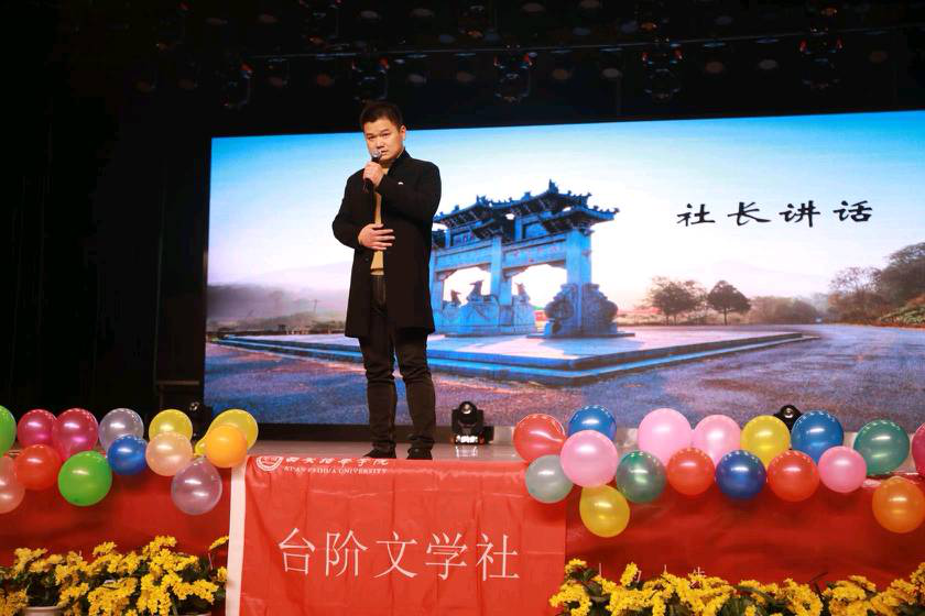 活动伊始,由蔡亮书记讲话,他感谢各位到场的嘉宾,肯定了台阶文学社过去取得的成绩,对未来发展的提出期待。几个精彩的节目之后,中文系副主任罗妮老师讲话,阐述了台阶20年发展历程,希望台阶向着既有的目标更好地前行。