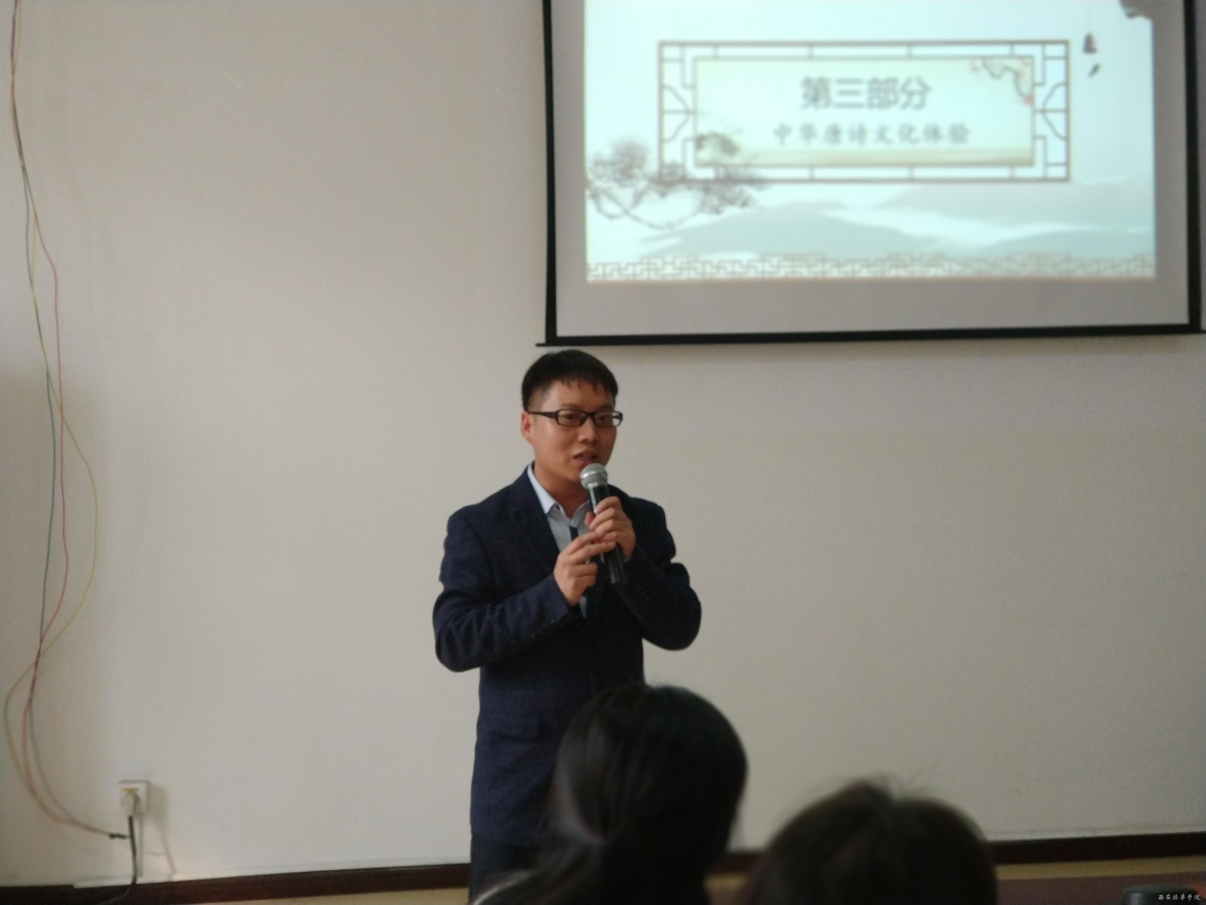 此次活动首先由“汉服断代”与“投壶游戏”进入热身阶段,以情景演绎的新模式让参与代表亲身体验,感受传统文化的综合魅力。其次中文系申艳霞老师带来的《中华文化文字体验》,以视频导入的方式,述了汉字的演变中的“”象形“”与“”会意“”部分。与会代表积极参与“识文断字”游戏环节,再现教学环节中的课堂互动,极大促进了教学环节的提升。紧接着由王中俊老师分享了中华唐诗文化体验环节,他另辟蹊径以杜牧的“”叹花“”诗作品导入并以现场扮演等方式引人入胜,探究作者的心路历程,在不知不觉中感受到了唐诗的意蕴之美。最后,由陕西省社科院博士、助理研究员王晓勇老师以通俗易懂,妙趣横生的语言分享了“大唐盛世的三大要素”。他以时下流行易于接受的电视剧《长安十二时辰》导入课程,内容指出“大唐盛世的主要成因在于多元的宗教、开放的民族与全方位的文艺”。他娓娓道来将讲座气氛推入高潮,引起强烈的共鸣,进一步再现了应用技术型转型过程中的课程改革新路径与新方法。
