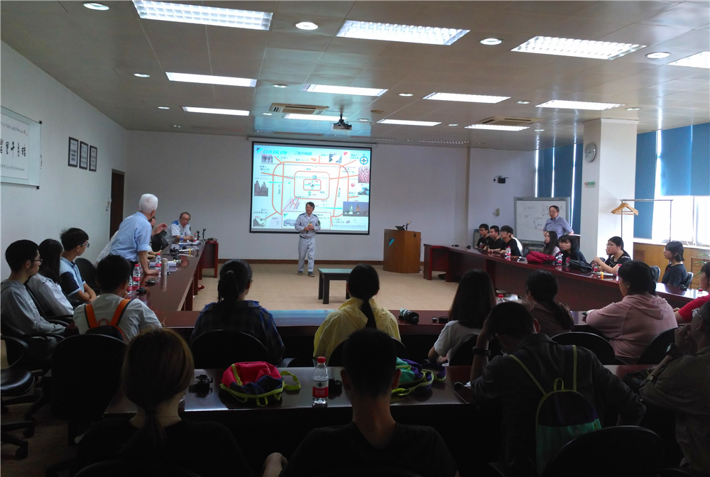 田中总经理首先向同学们的到来表示欢迎,并为同学们讲解公司的业务、产品样品及成就。在展示板上方“大金的世界 世界的大金”这一行文字,显示出大金公司的骄人业绩和声誉。高桥部长带领同学们进入生产车间参观,并向大家做了详细介绍。