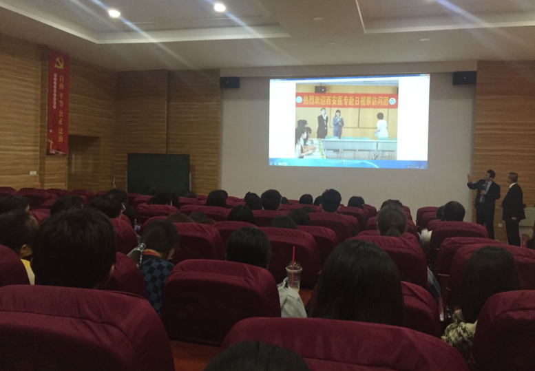 主讲人DynaLink株式会社石神成夫(ISHIGAMI SHIGEO)社长,向与会师生详细地介绍了日本社会的当前老龄化状况,政府的新出台的相关介护人才培养引进政策及法规,与陕西省、西安市教育机构的合作培养人才的项目及其实施状况,也展示了与我校共同培养介护人才的计划构想。