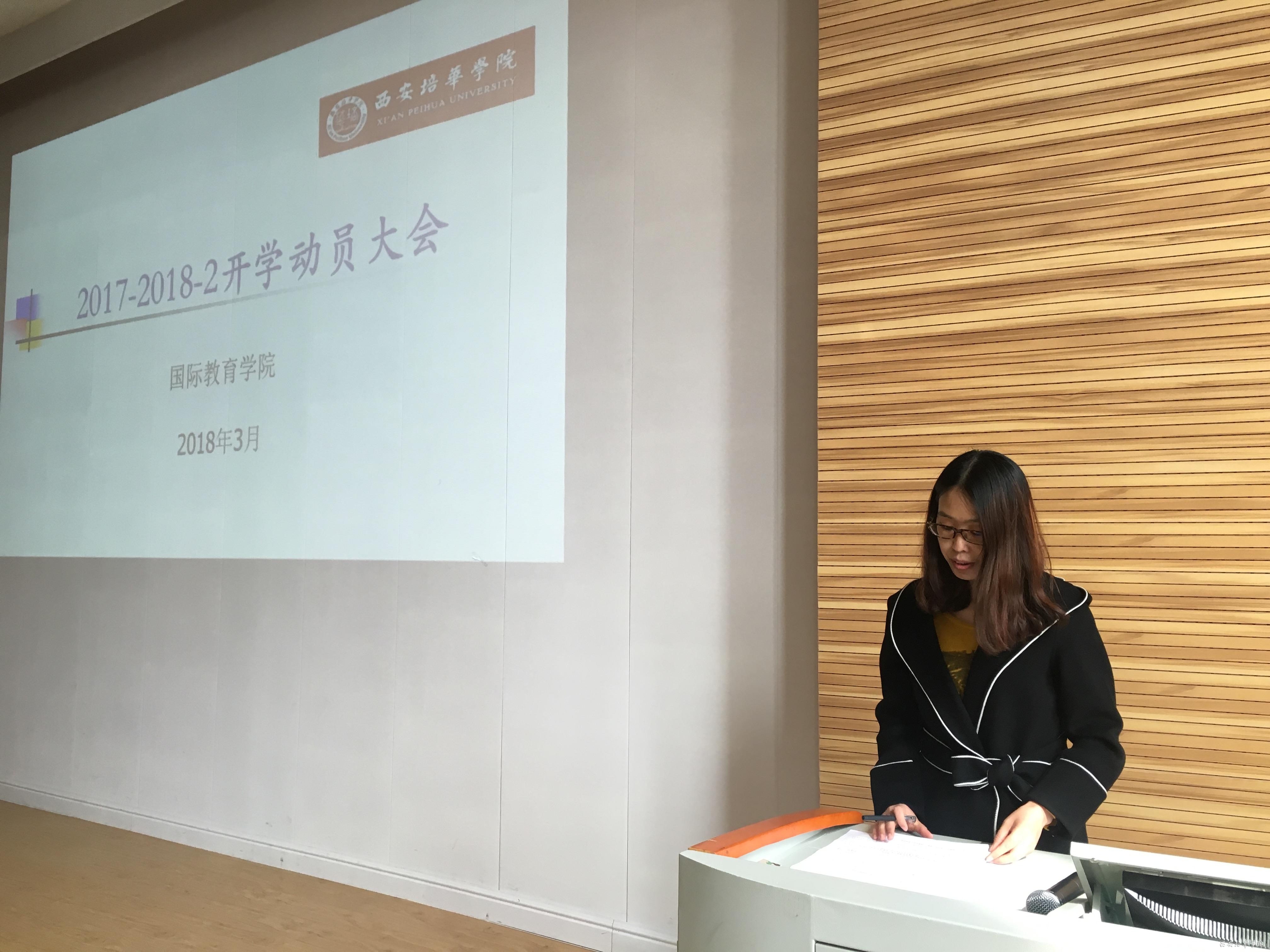 新风貌迎接新学期,新思路指引新发展。3月1日,农历正月十四,迎着新年的晨曦,国际教育学院于J101教室召开了新学期开学动员大会。出席此次会议的人员有:西安培华学院副校长、国际教育学院院长刘越莲教授;国际教育学院党总支书记兼行政副院长梁蕊教授以及我院全体教职工,会议由梁蕊副院长主持。