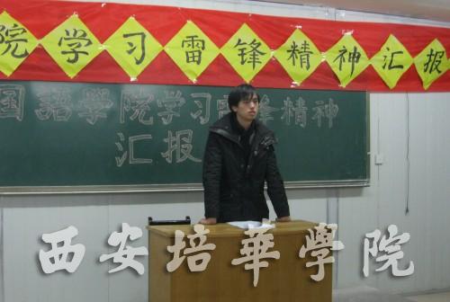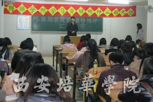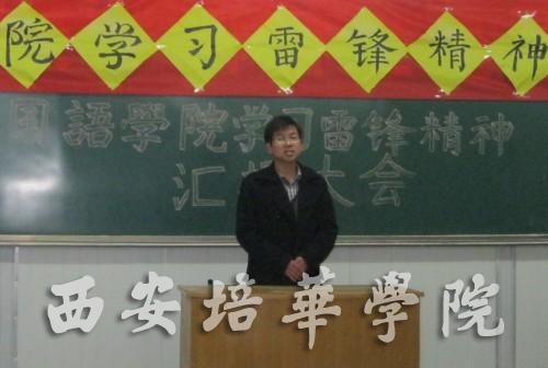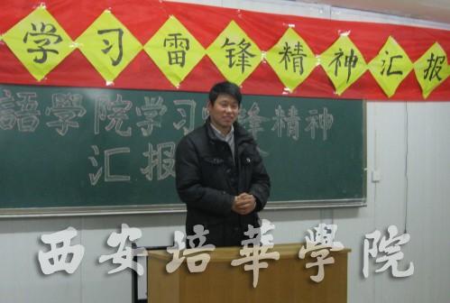 为了让同学们进一步了解雷锋,向雷锋同志学习,传承雷锋精神,我院于2012年3月5日19时,在东1301教室召开了学习雷锋精神报告会。外国语学院党总支副书记兼院长助理马平安、学生科科长吴维东、团总支书记蔡亮以及全体辅导员老师参加了报告会。报告会由吴维东、蔡亮以及一名学生代表主讲。
