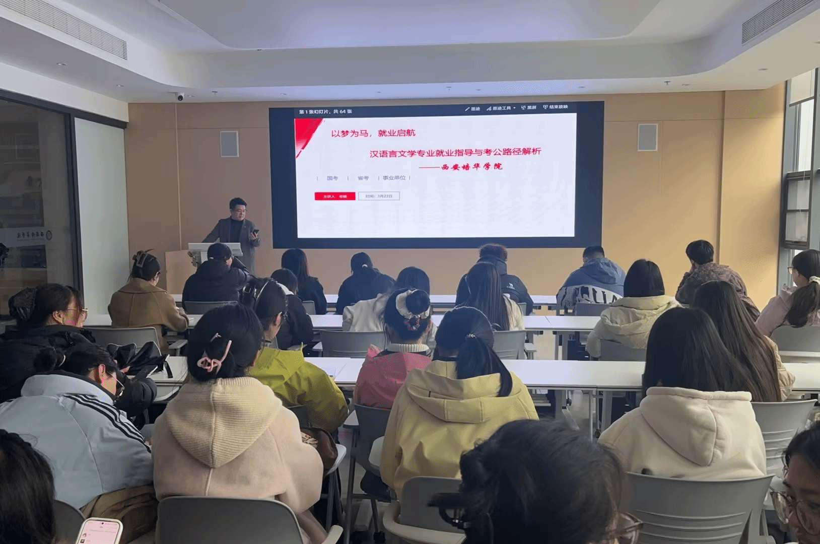 3月23日下午,文学院特邀知名西工大客座讲师、具有多年公职系统招录研究与高校就业辅导经验的杨志远老师,为汉语言文学专业的学子们带来了一场内容翔实、针对性强的“以梦为马,就业启航——汉语言文学专业就业指导与考公路径解析”专题讲座。职业规划功能馆内座无虚席,气氛热烈,吸引了多名学生踊跃参与。