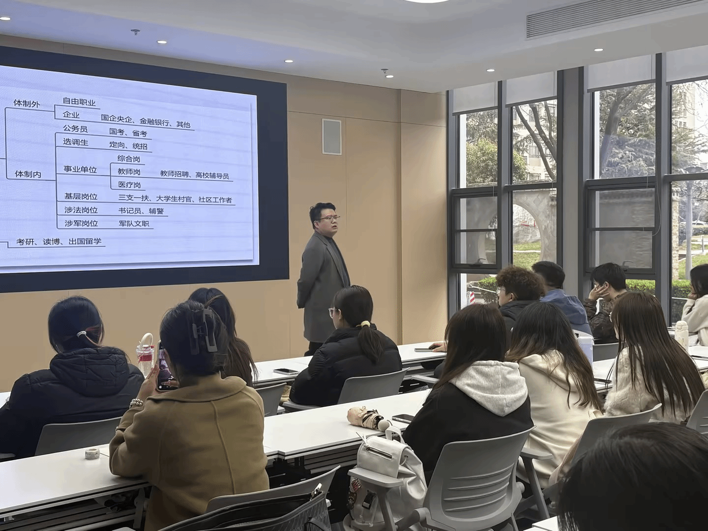 针对同学们高度关注的公务员及各类编制内考试,杨老师进行了极具实战性的“庖丁解牛”。他详细解读了近年来国考、省考、选调生、事业单位招考中面向中文类专业开放的岗位特点与变化趋势,尤其对党群机关、办公厅(室)、宣传部门、文联作协等单位的任职要求进行了深度剖析。在备考策略部分,杨老师分享了行之有效的复习方法:如何将专业学习中练就的文本分析能力转化为“行政职业能力测验”中言语理解的高正确率;如何将文学评论与写作训练的系统思维,运用到“申论”考试的材料概括、对策提出与文章写作中,形成比较优势。他还就面试中的形象塑造、言语表达及突发事件应对技巧提供了专业建议,为有志于服务公共部门的同学提供了从“知”到“行”的清晰路线图。