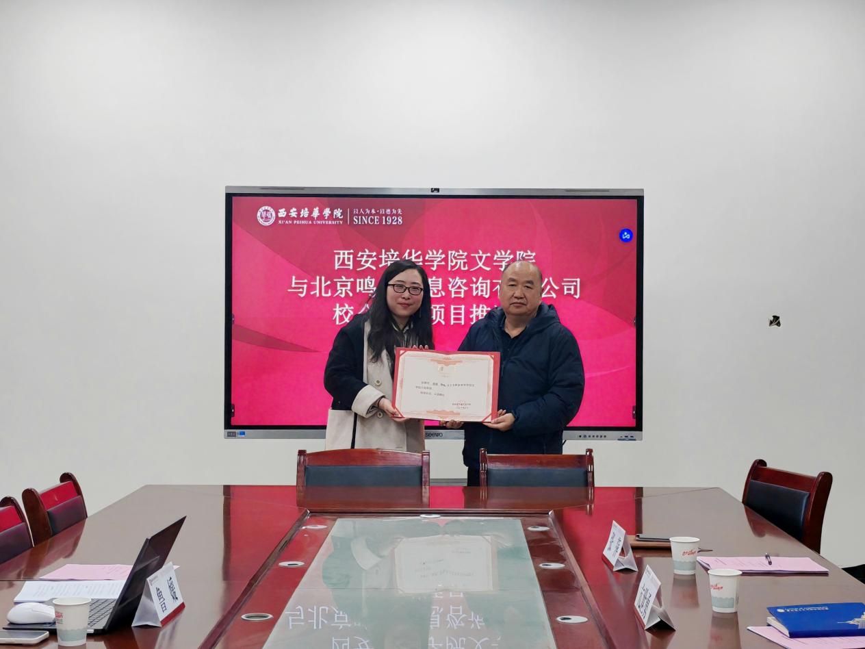 为深化产教融合、推动校企协同育人,3月24日下午三点,西安培华学院文学院与北京鸣玉信息咨询有限公司校企合作项目推进会在第四会议室举行。本次会议由文学院中国现当代文学教研室主任李雅楠主持,文学院亢世勇教授、院长助理张萍教授、北京鸣玉信息咨询有限公司CEO鲁媛及双方相关负责人出席会议。
